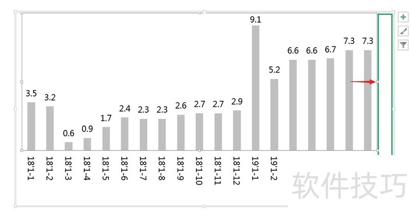 1、 做完excel图表后,会发现图表左右侧有空白却不能填充满图表,也就是绿色框有很大部分的空白,但用鼠标拖拽也不行,就是下图红箭头,用鼠标拖拽是拖拽不动的,如下图: