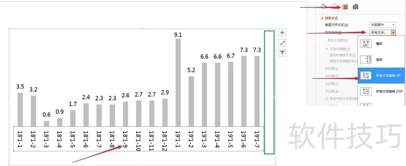 2、 解决办法是,双击横坐标轴,在右侧设置坐标轴格式面板中,选择十字架那个大小属性,然后在文字方向中选择所有文字旋转90°,如下图: