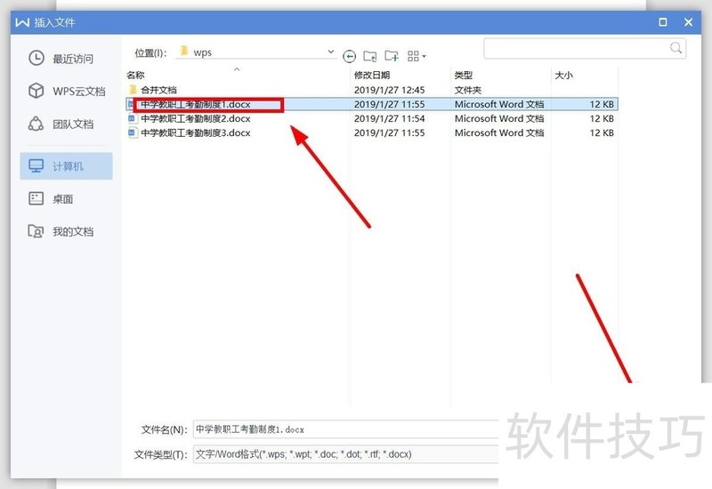 5、 在弹出窗口,选中要插入内容的文件后,单击“打开”