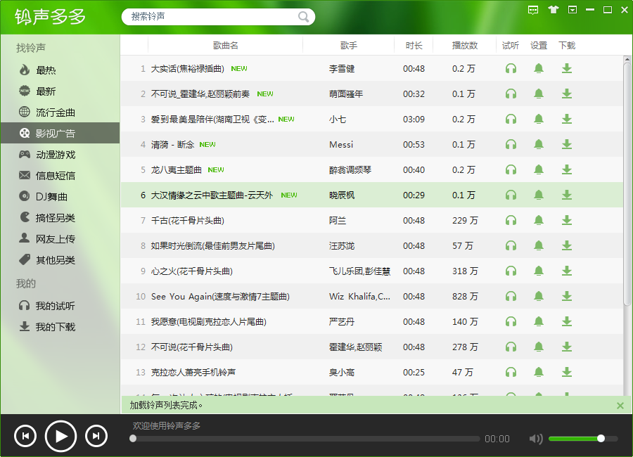 官方软件分类:音乐播放大小:5.39 MB时间:2026-08-17软件介绍:铃声多多电脑版免费下载海量的流行金曲手机铃声,而且还是AAC格式的,支持单首下载和整页下载,非常方便实用 立即下载校园铃声任我行 5.03