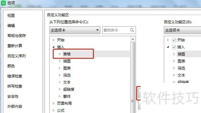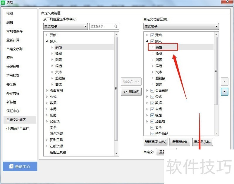 5、 在右边的自定义功能区里面选中【插入】在左边选中【插入】里面的【表格】,然后点击【添加】