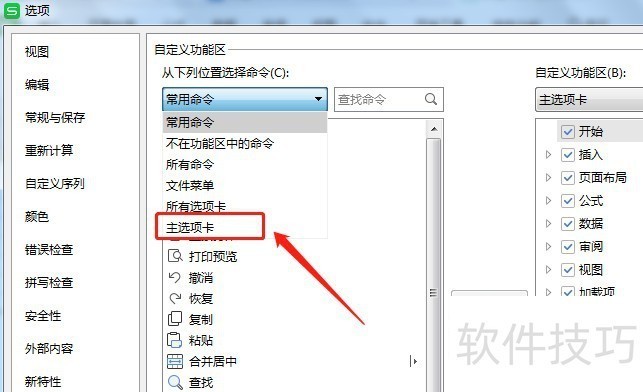 3、 点击左侧栏的【自定义功能区】