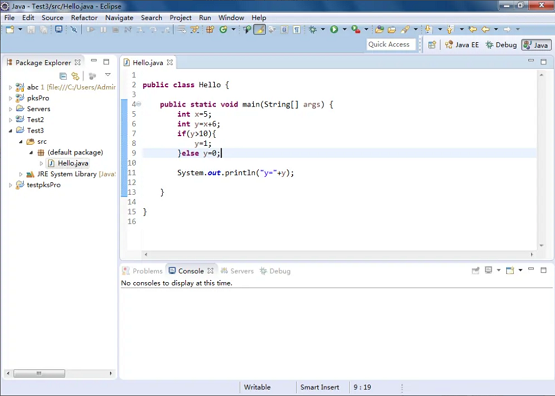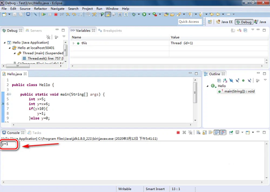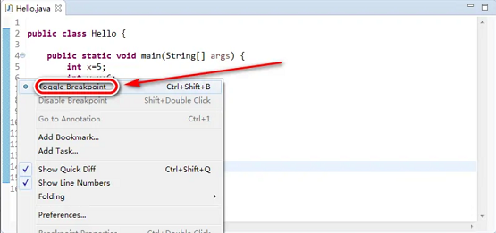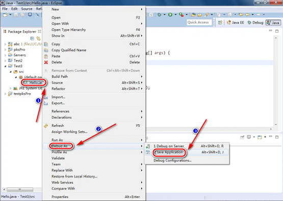 3、右键点击Package Explorer中的Hello.java,选择【Debug As】-【Java Application】。