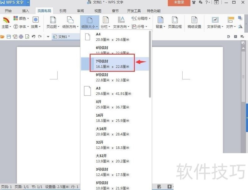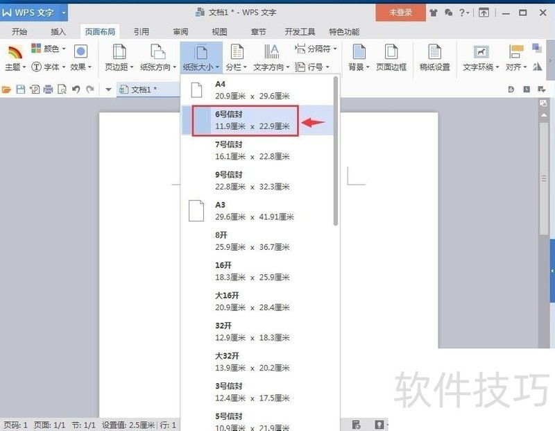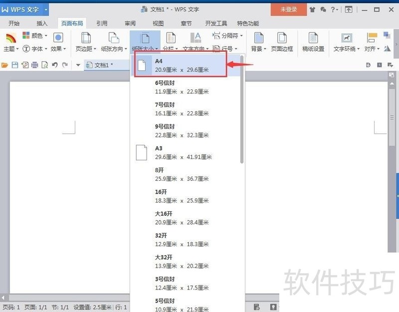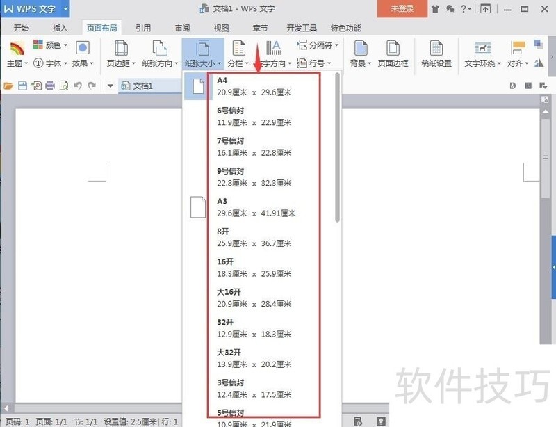 4、 点击纸张大小,在下拉菜单中罗列出一系列的纸张大小及其对应的纸张尺寸;