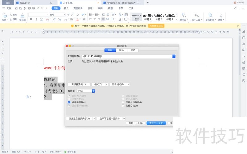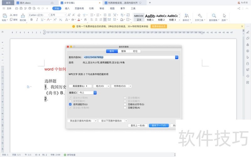 3、 按住“ctrl+H"组合键,打开“查找与替换”对话框。在“查找内容中输入内容,如下图。再勾选上“通配符”。