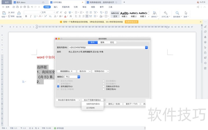 4、 点击“在以下范围内查找“,选中“主文档”。