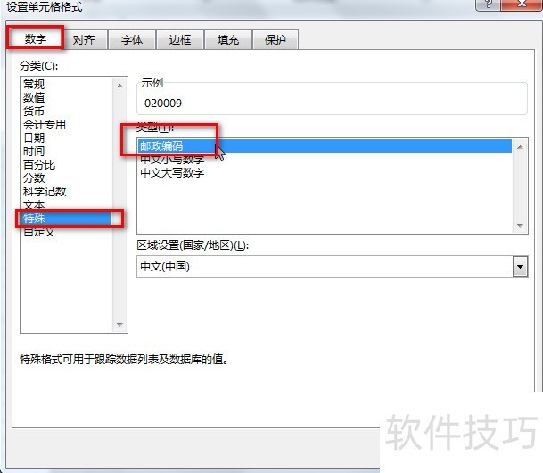 2、 弹出【设置单元格格式】对话框,切换到【数字】选项卡,在【分类】列表框中选中【特殊】选项,然后在右边【类型】列表框中选择【邮政编码】选项。
