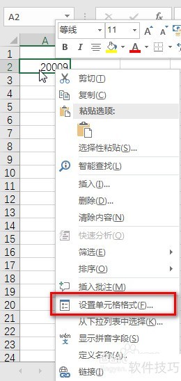 1、 在单元格输入020009,选中改单元格并单击鼠标右键,从弹出的快捷菜单中选中【设置单元格格式】