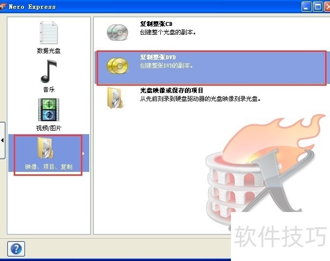 8、 而当你有一个已经存储好数据的光盘,但是还想再要一张需要怎么办呢,其实很简单,先把这张存储好数据的光盘放入刻录机中(确认你的光盘是DVD还是CD,本次的光盘是DVD),然后打开nero,选择”映像、项目、复制“,然后选择复制整张DVD