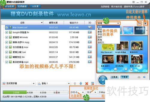 1、 基本简易的操作步骤,如图所示为:①添加视频,格式基本不限;②光盘开始菜单模板设置;③相关参数:光盘类型、视频宽高比、视频比特率,下次有相同刻录时可以忽略;④刻录到DVD光盘。