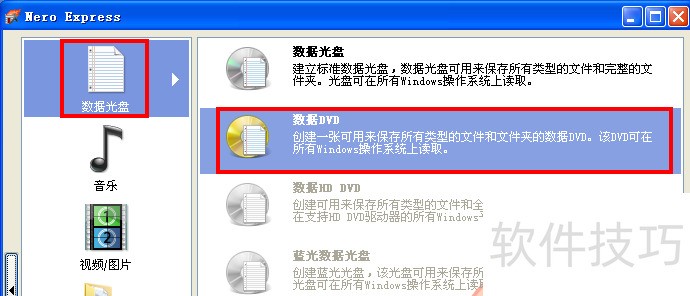 2、 根据光盘类型,选择刻录类型,刻录数据光盘与刻录数据DVD方法一致,这里以刻录DVD为例。选择“数据光盘”—“数据DVD”。