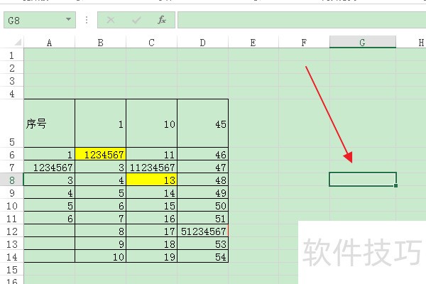 2、 在编辑区中输入表格数据,选中空白单元格“G8”。