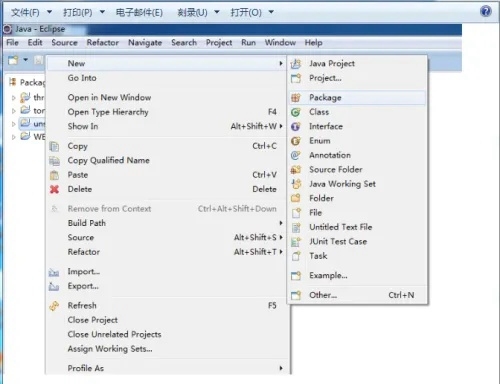 3、在Eclipse左侧工程列表中,右键点击工程名,选择 New -> Package,在弹出窗口中填写包名并点击 Finish。