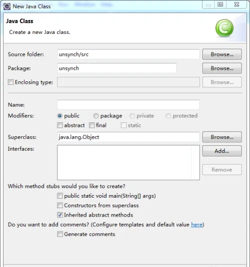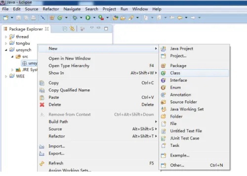4、展开工程名,右键点击包名,选择 New -> Class,在弹出窗口中填写类名,若包含主方法,勾选 public static void main(String[] args)。