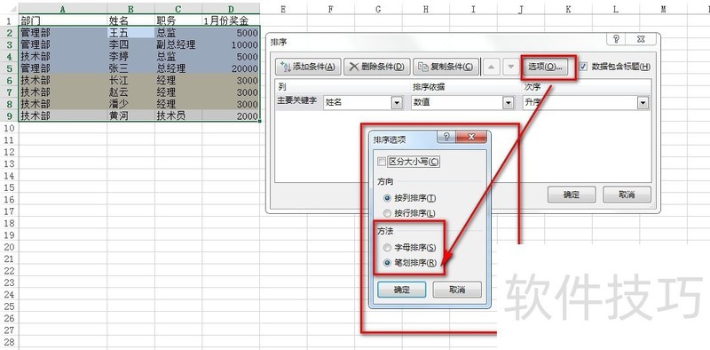 2、 在 ”排序选项“对话框中,按下图所示,选择“笔划排序”