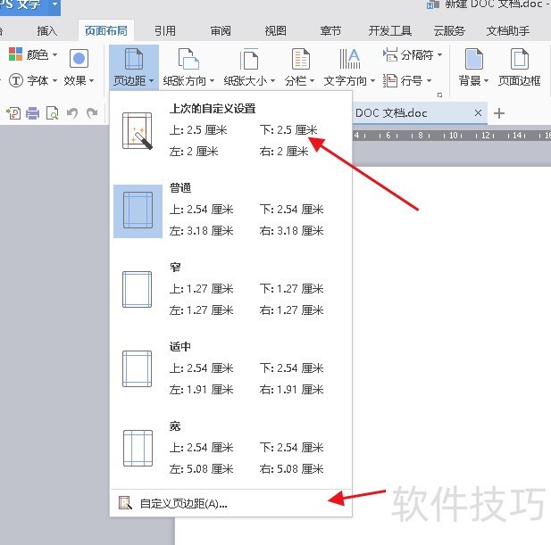 4、 如果在最近使用过的页面边距中有自己想要的装订线边距,那么可以直接点击使用。如果没有可以自定义设置。