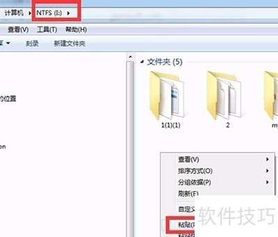 2、 然后打开I盘,在I盘的空白区域右键单击,选择“粘贴”,如图所示: