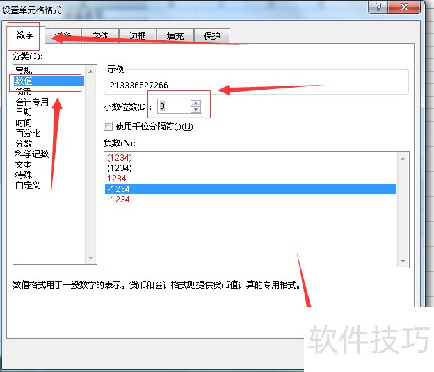 3、 在跳出的对话框中,选择【数字】——【数值】,把小数位跳到0