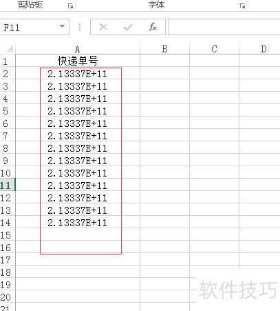 1、 如下图,我们的快递单号都显示错误,不能显示完整的数字