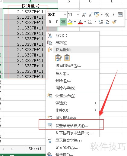 2、 选中快递单号的单元格,鼠标点击右键——设置单元格格式
