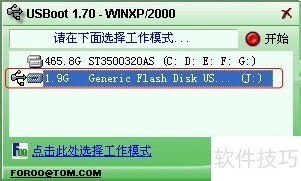 3、 注意不要选到硬盘,一定要选择U盘,U盘的容量一盘在8G以内。若不慎将电脑硬盘格式化了,将造成数据无法恢复的严重后果。点击“点此选择工作模式”选择“ZIP”模式
