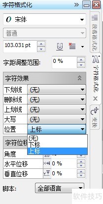 3、 在字符格式化的“字符效果”栏下“位置”选择“上标”或者“下标”;