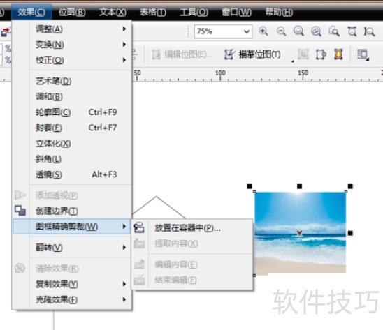3、 选中您导入的图片,点击Coreldraw12菜单栏中的【效果】选项,在弹出的选项中点击【图片精确裁剪】然后选择【放置容器中】。
