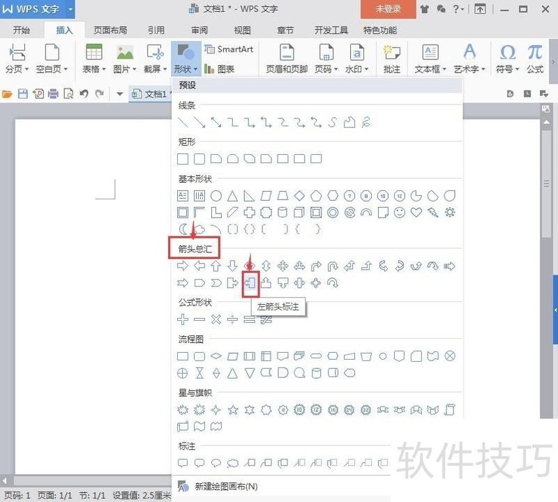 4、 在打开的形状库中,找到箭头总汇,点击左箭头标注;