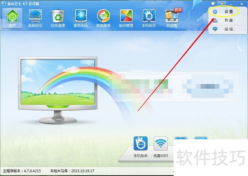 1、 首先双击桌面金山卫士图标,进入如图所示页面,找到图中红色箭头指出的部分,进行单击2这时弹出下拉,选择“设置”