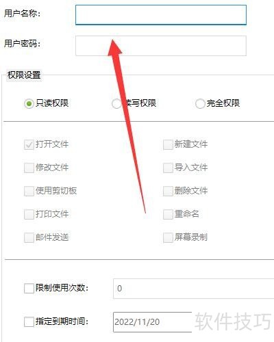 4、 在弹出窗口中,设置“用户名、用户密码、权限”等参数