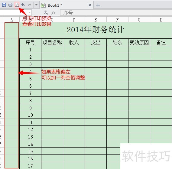 4、 点击打印预览查看表格效果,如果表格偏左可以加一列进行平衡。