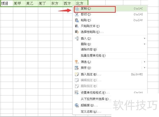 2、 选择横向单元格的内容,点击鼠标右键,点击“复制”