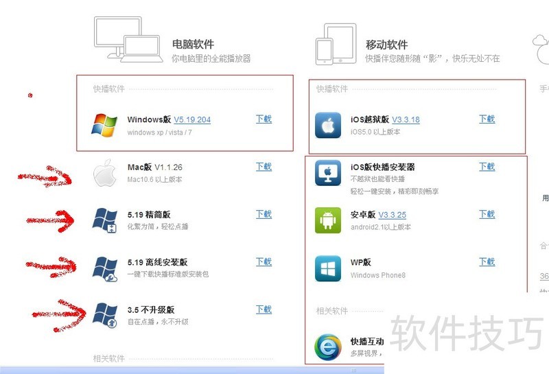 3、 进入软件下载页面,选择你要下载的快播软件种类和版本