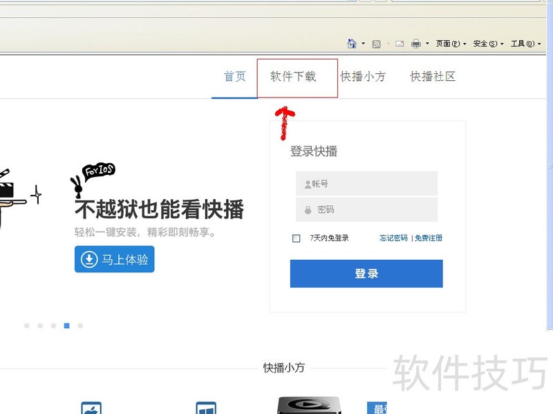 2、 进入快播官网后,点击网页右上方【软件下载】选项
