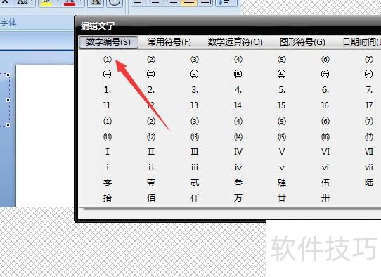 4、 画一个文本框,在弹出的窗口里,单击数字编号,选择数字①。
