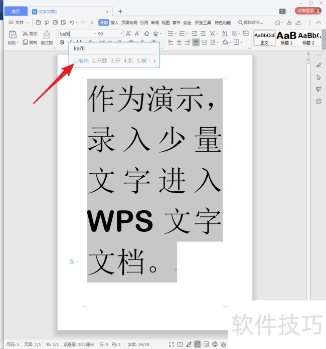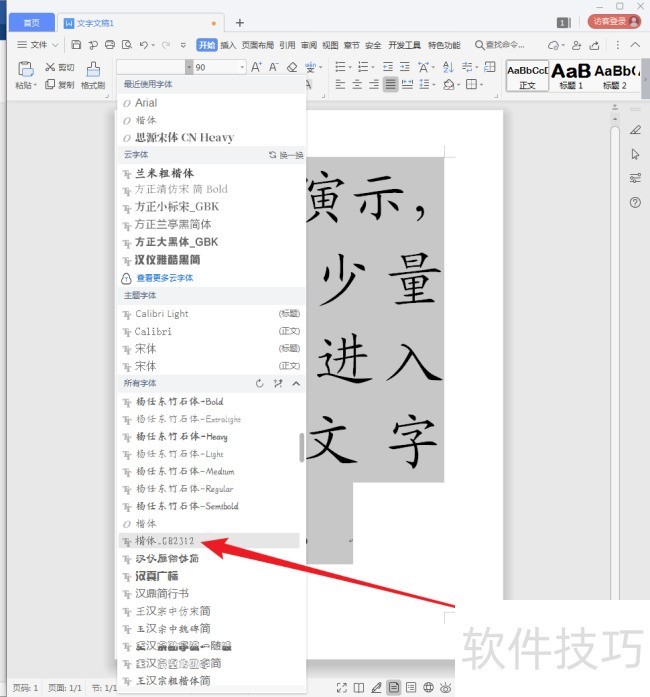 3、 接下来,需要给汉字设置楷体GB字体。通常的操作是,选中汉字,再点击字体下拉箭头,显示出电脑上安装的全部字体。
