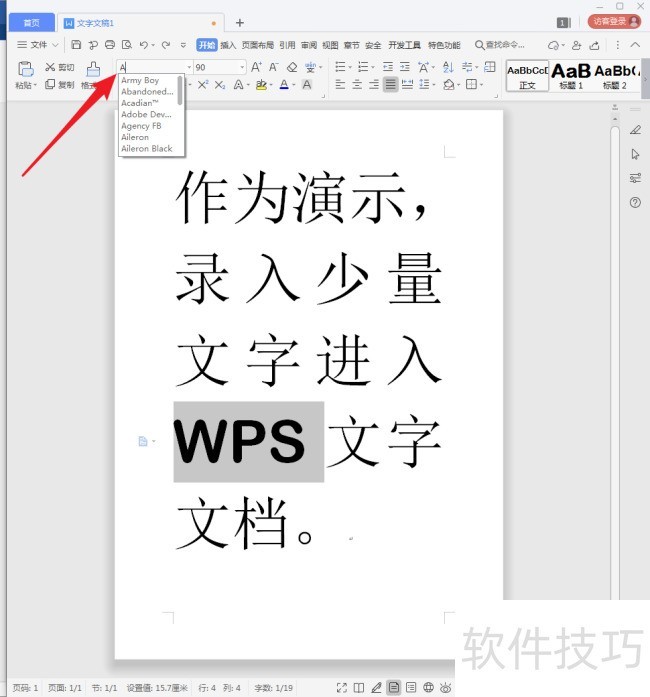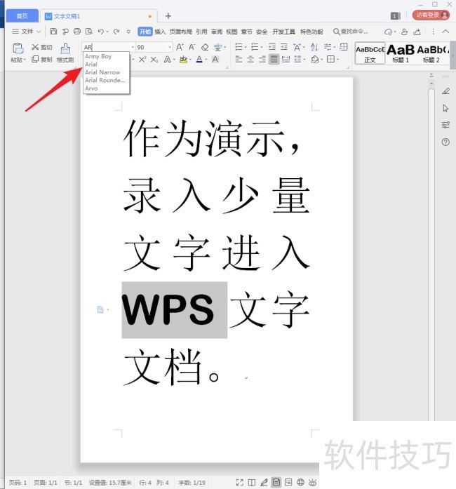 9、 英文字体又如何呢?比如,需要给英文设置名为Arial的字体。同样选中英文文字,在字体框中输入字体名称的第一个字母【A】,就会显示出电脑中以A开头的所有字体。