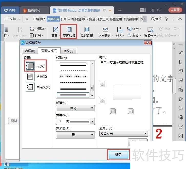 5、 点击“页面边框”,弹出“边框和底纹”编辑框,选择边框【无】。