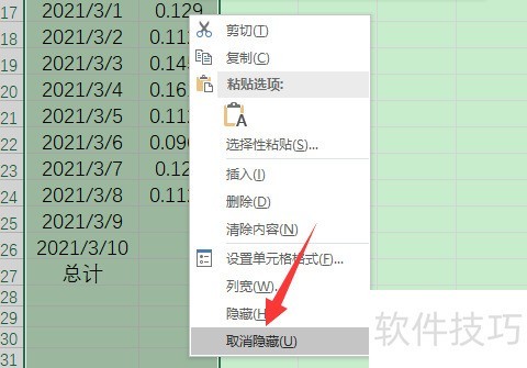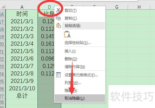 1、 excel取消隐藏没反应,很可能是没有选中包含隐藏列或行所在的单元格,比如,隐藏了B、C列数据,在取消隐藏时,只选择了A列或者是D列,然后右击鼠标,点击取消隐藏,这样是无法取消隐藏的