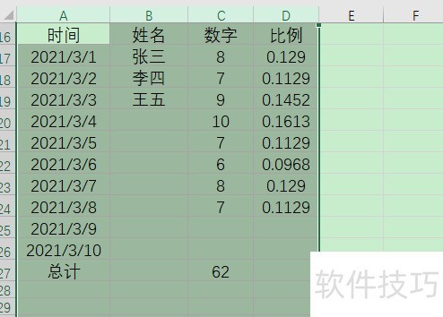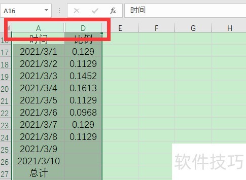 2、 正确做法是,先选中包含隐藏列所在的单元格,比如隐藏了B、C列,可以同时选中ABCD四列,这样就把隐藏的B、C列也选中了