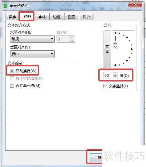3、 在弹出【单元格格式】对话框中,在【对齐】选项卡下,勾选【自动换行】,调整文字方向为90°,单击【确定】,如下图所示: