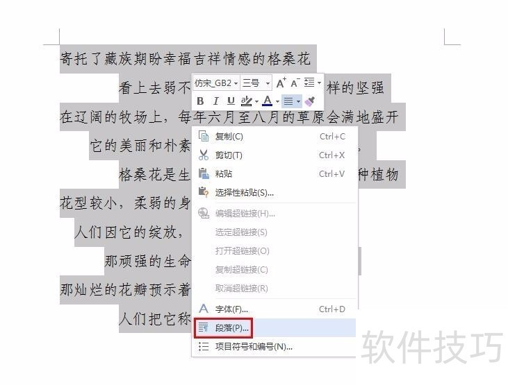 2、 第二步:选中要对齐的文字,单击鼠标右键选择“段落”。