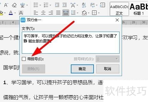 5、 在打开的双行合一窗口中,我们可以选择为文字加上括号,只需要勾选“带括号”前面的复选框。