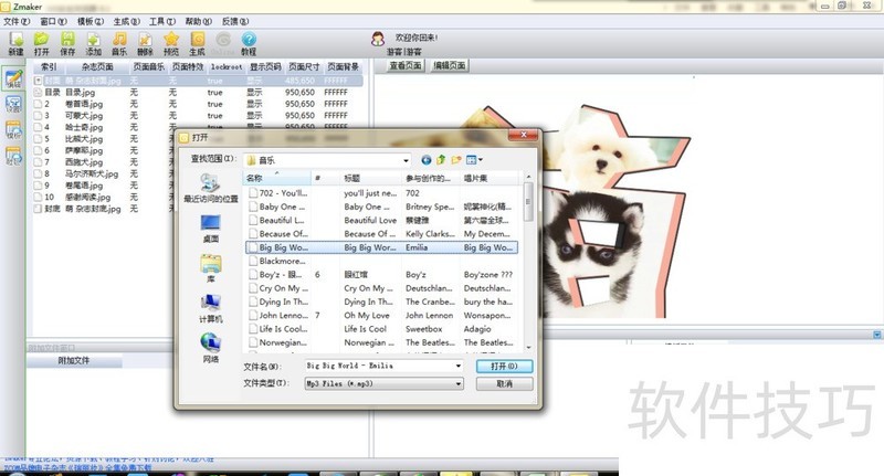 7、 找到喜欢的音乐之后,鼠标左键单击“打开”,就设置好了。不过现在只设置了一页的音乐,为了保证整本杂志都能播放音乐,为了保持连贯性,我们把每一页都设置成相同的一首歌,那么在翻页时,音乐也是连续播放的。