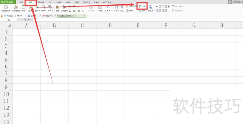 2、 选中一个单元格,然后选择【插入】选项卡,然后选择【对象】属性,如下图。