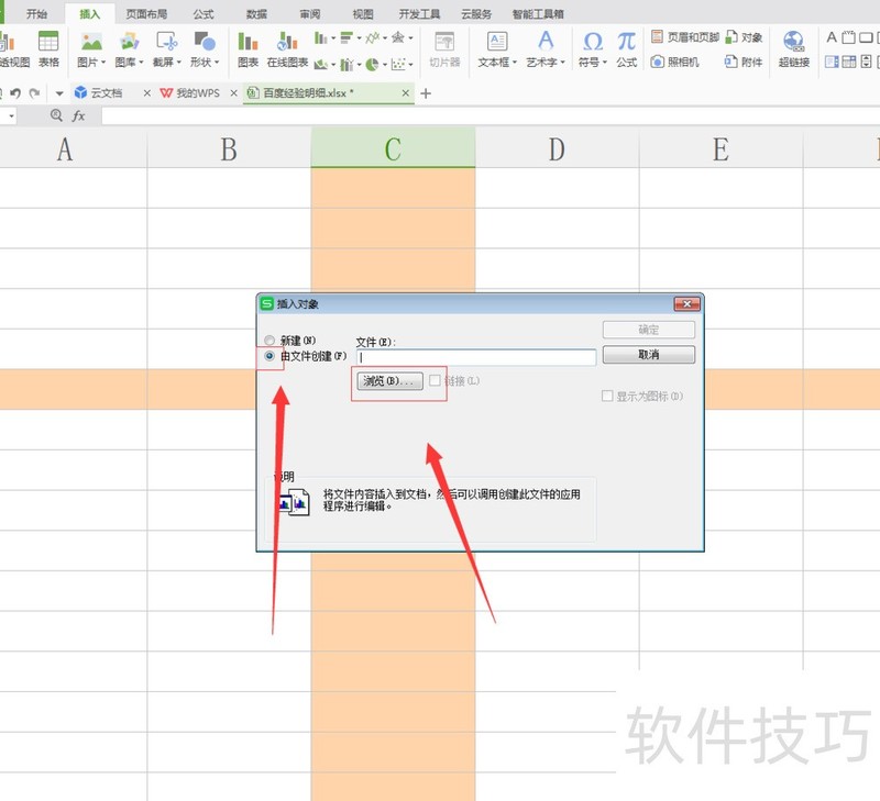 3、 弹出【插入对象】对话框,我们选择【由文件传建F】,然后单击【浏览】按钮,如下图。