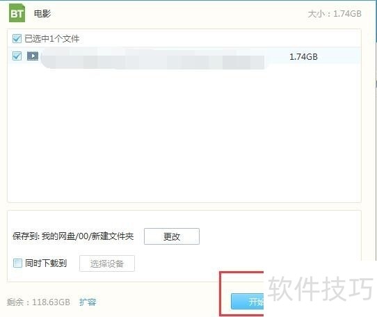4、 此时弹出对话框,显示种子文件具体内容,选择需要下载的内容后及储存在网盘的位置后,单击“开始下载”,即可将种子内容离线到网盘。