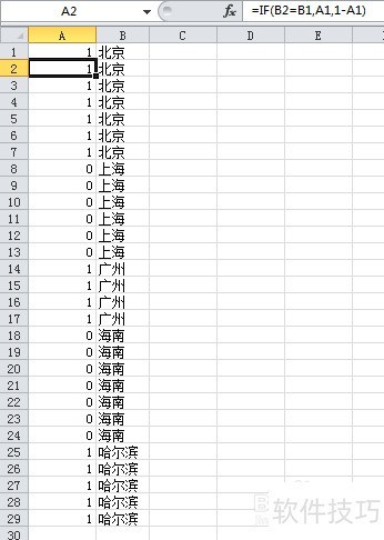 2、 步骤一:1. 在A1单元格输入“1”,A2填充公式“=if(B2=B1,A1,1-A1)”,下拉公式至A29;2. 复制A1:A29粘贴至A1:A29,仅保留文本。