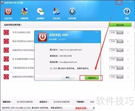 1、 请先打开软件,点击右上角的倒三角的图标-关于定时关机3000-注销本机。