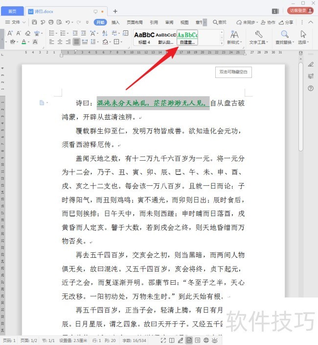 8、 然后点开样式框,就能看到刚才建立的新样式了。但是要注意,之前选中的那些文字当前仍然是【正文】样式。